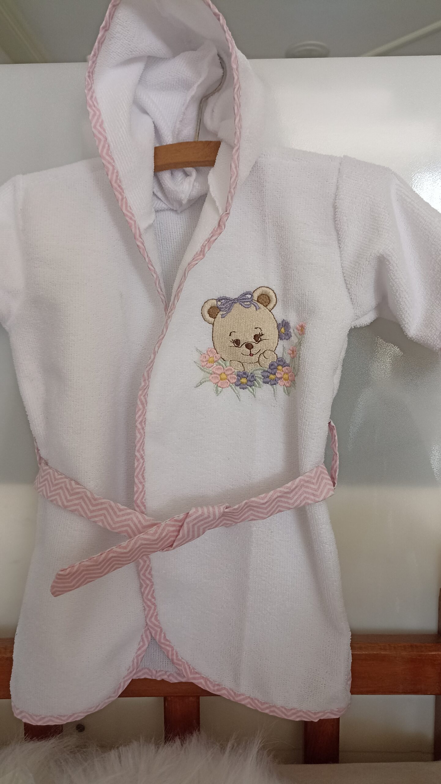 Esse produto e de excelente qualidade, veste crianças de 3 meses á 1 ano de idade. Material entoalhado super leve e marcio, a peça conta com com capuz e barra de viés, bordado na frente. Confeccionamos nas modalidades masculino e feminino. Com fitas do próprio tecido para serem amarrado a cintura.