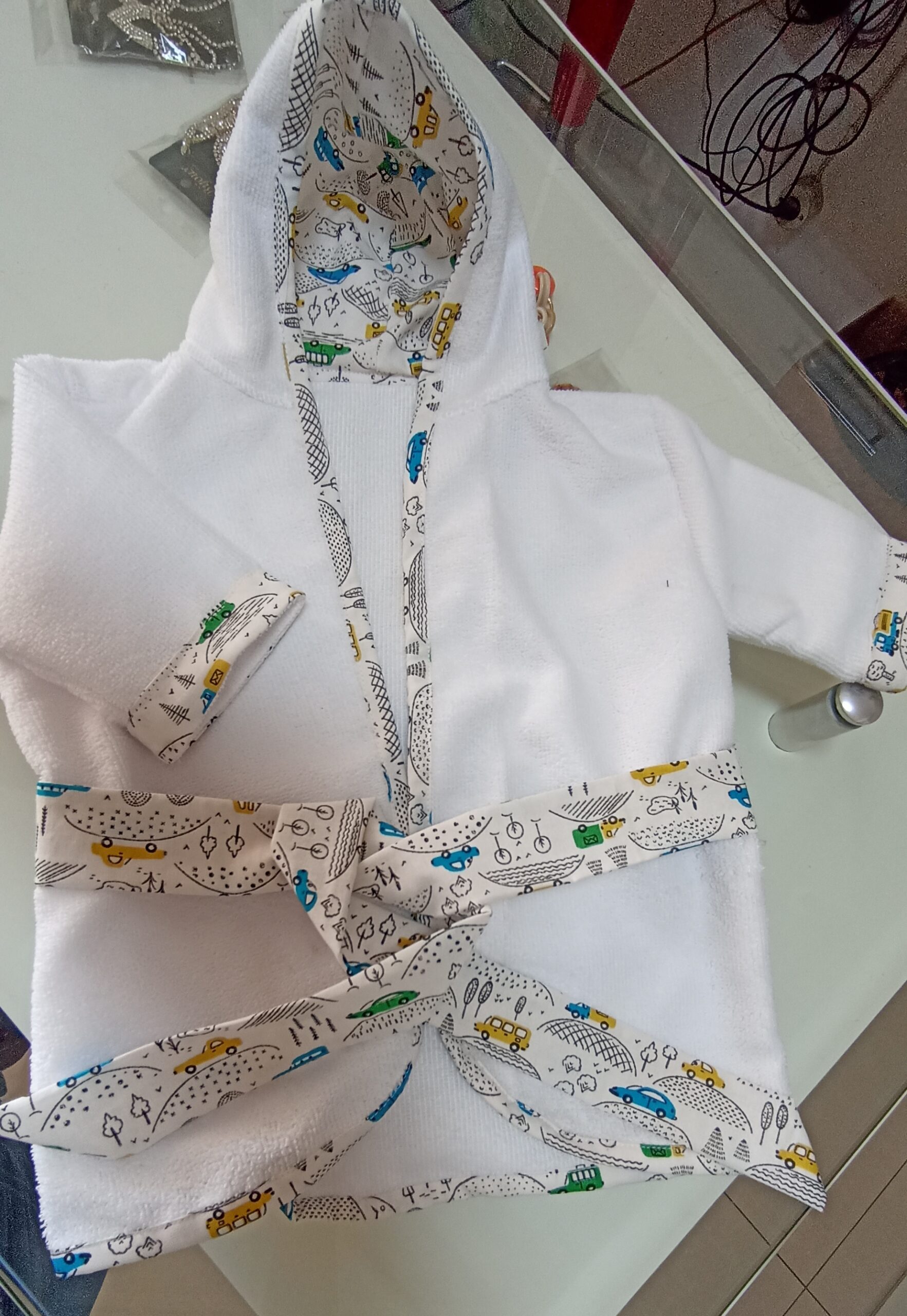 Esse produto e de excelente qualidade, veste crianças de 3 meses á 1 ano de idade. Material entoalhado super leve e marcio, forrado no capuz. A peça conta com com capuz e barra de viés, bordado na frente. Confeccionamos nas modalidades masculino e feminino. Com fitas do próprio tecido para serem amarrado a cintura.